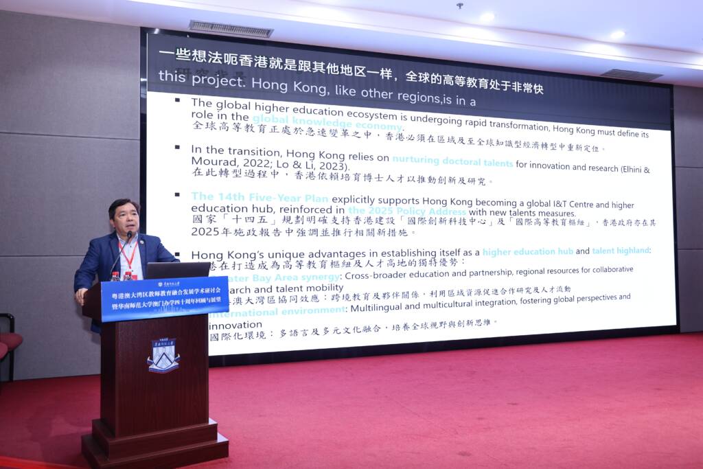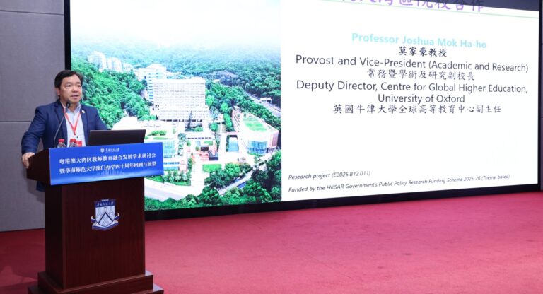 Professor Joshua Mok Ka-ho, Provost and Vice President (Academic and Research) of The Hang Seng University of Hong Kong (HSUHK), delivered a keynote address at the Academic Symposium on the Integrated Development of Teacher Education in the Greater Bay Area and Conference on the 40 Years of South China Normal University’s Educational Endeavours in Macao: Retrospect and Prospect on 13 December 2025. The event, hosted by South China Normal University, gathered education leaders to strategise on deepening regional academic cooperation in alignment with national development priorities.